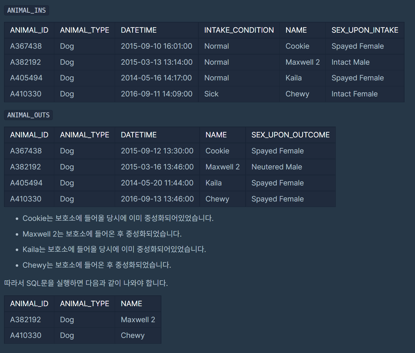 FROM ANIMAL_INS A1 LEFT JOIN ANIMAL_OUTS A2