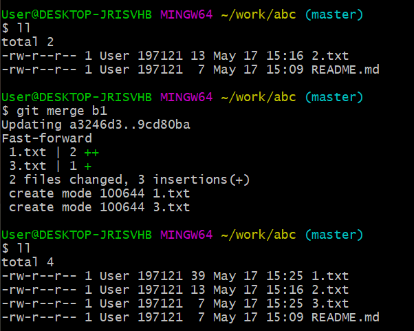git merge 명령으로 브랜치 합치기 (master->b1으로 가져오기)