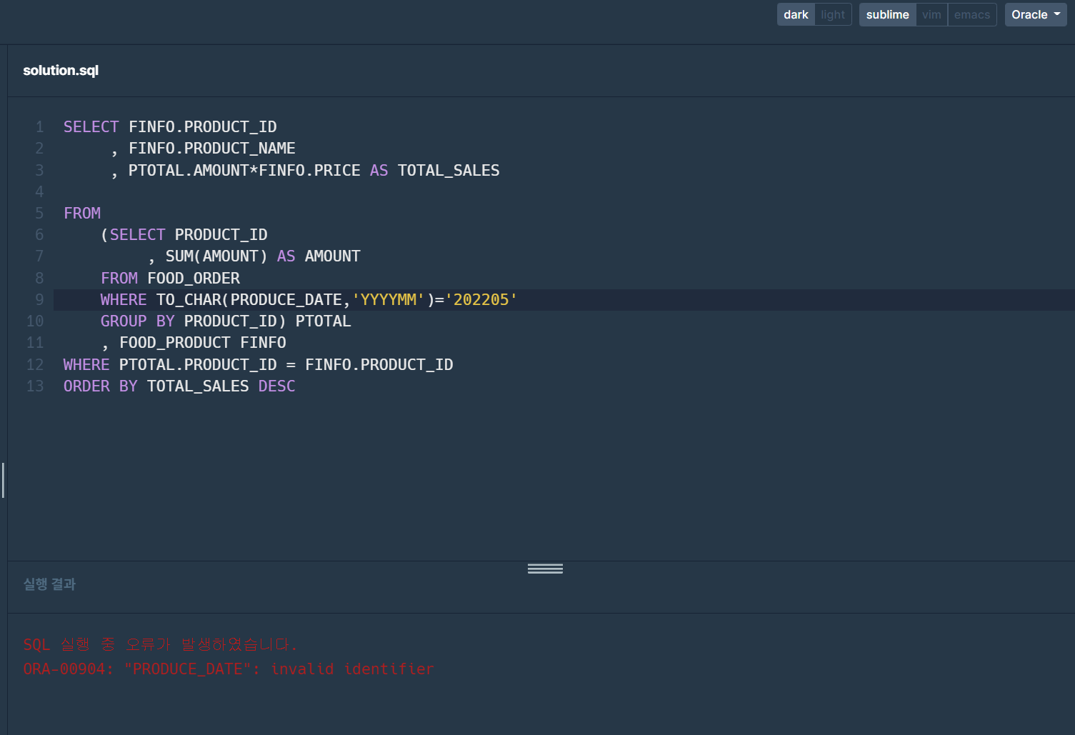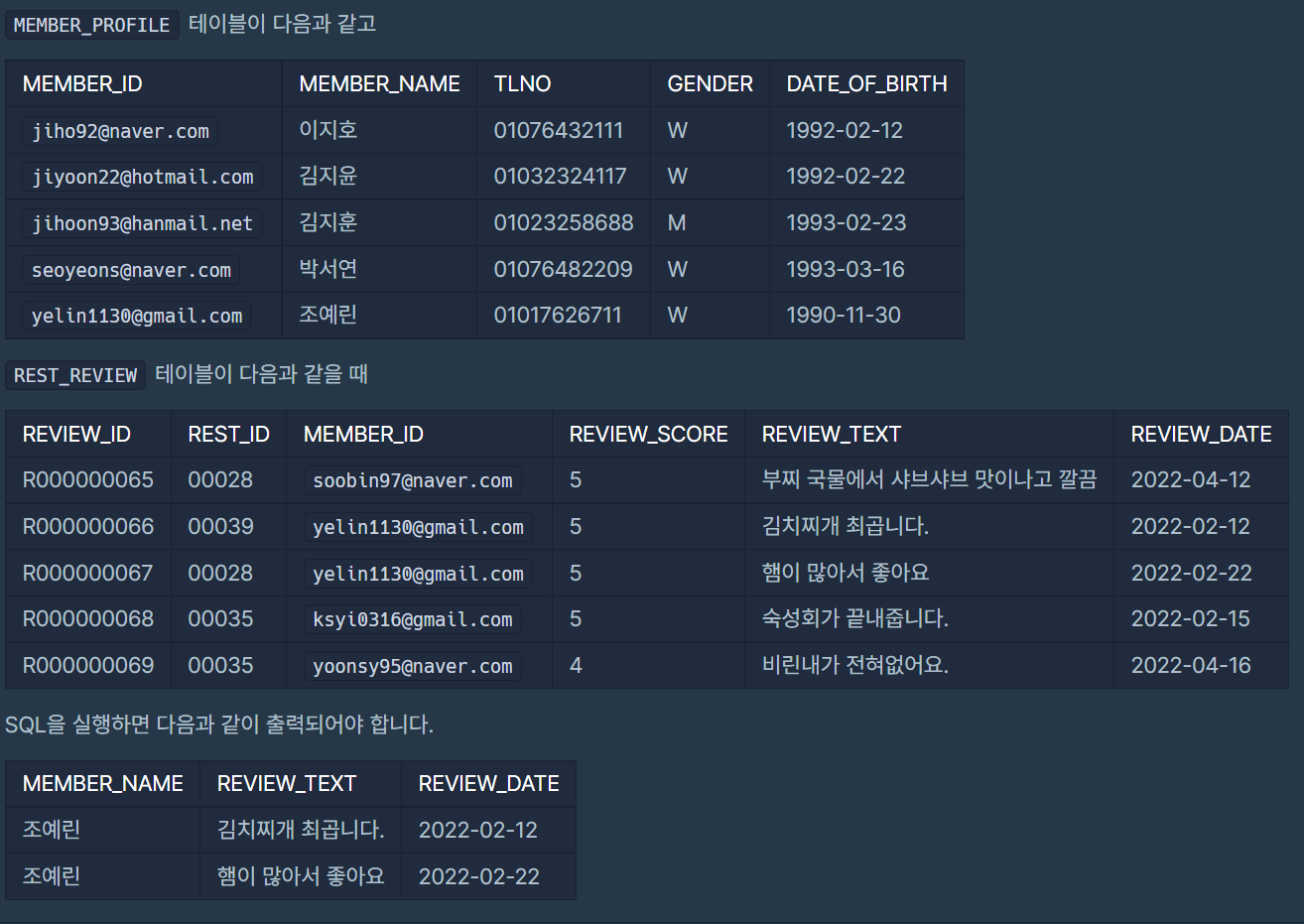 | 프로그래머스 (Level 4) : 그룹별 조건에 맞는 식당 목록 출력하기/ (SQL) MySQL, Oracle/ JOIN, RANK() (0) | 2022.10.10 |