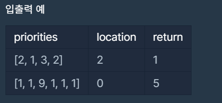 1. 대기 큐 첫 원소가 찾으려는 location이면서 max 우선순위이면 출력차례를 return