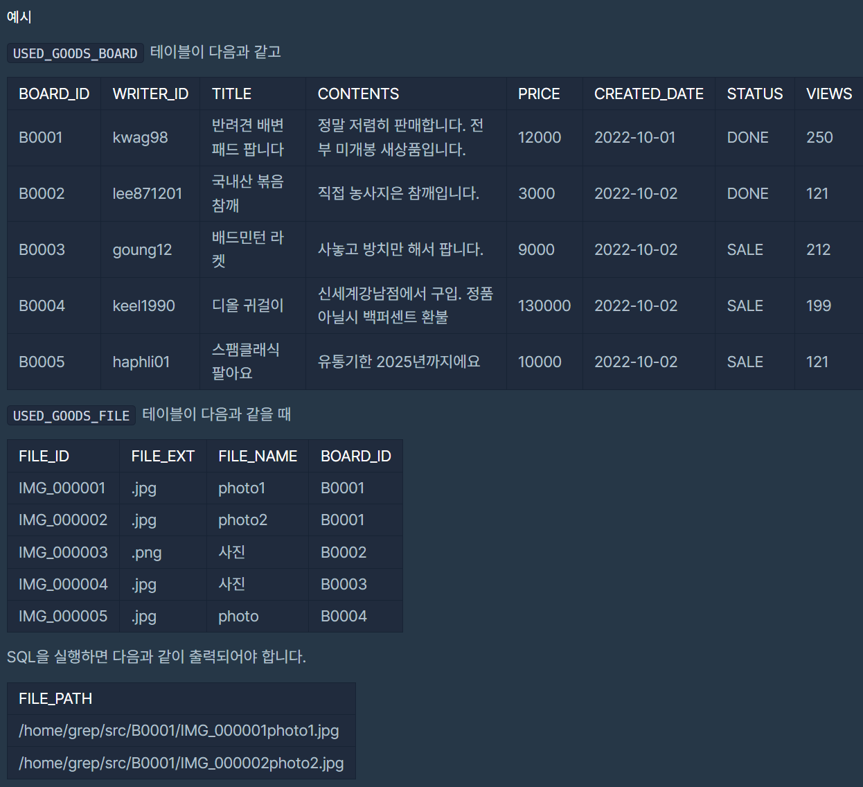 | 프로그래머스 (Level 3) : 조회수가 가장 많은 중고거래 게시판의 첨부파일 조회하기/ (SQL) Oracle/ WITH, JOIN (0) | 2023.04.25 |
